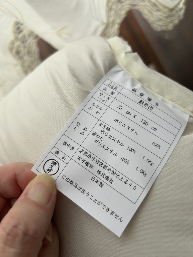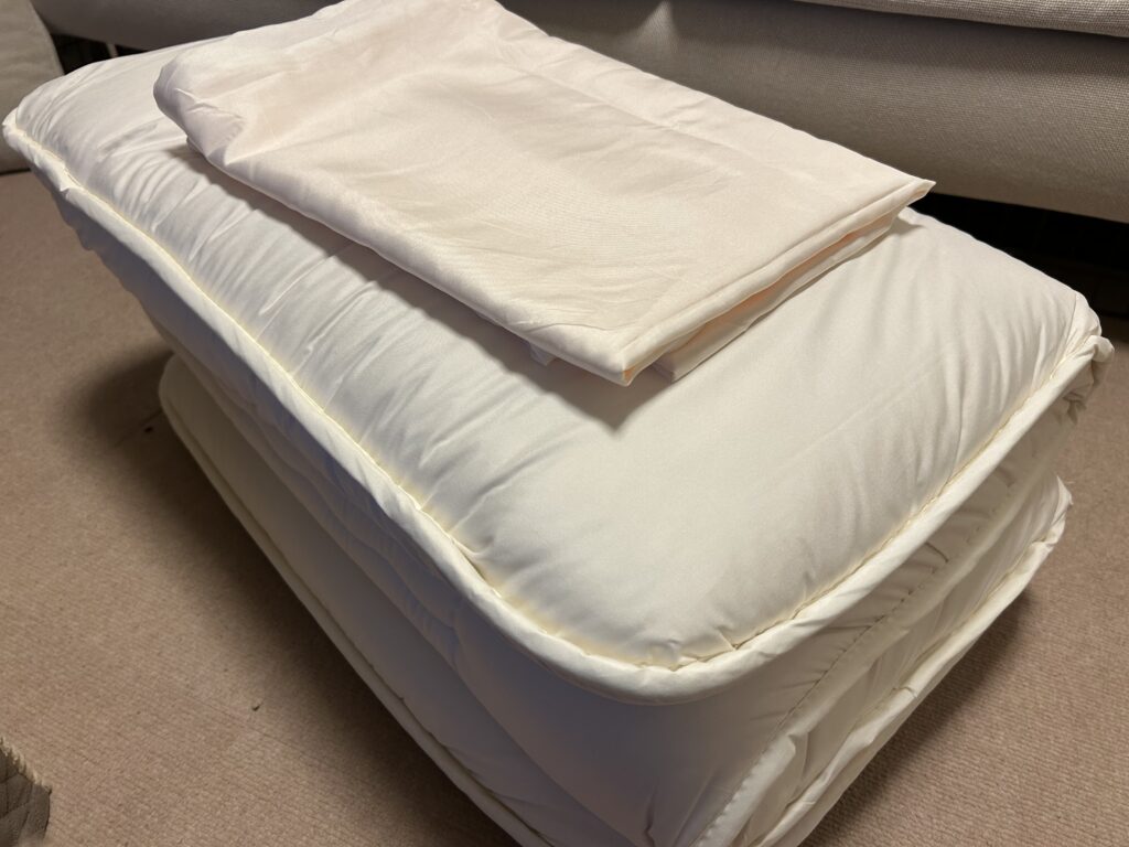 日本製で中綿はTEIJIN(帝人)の抗菌防臭・防ダニ機能付き。とても軽くて持ち運びも楽です。案件でも何でもありませんがおススメです。こちらです↓